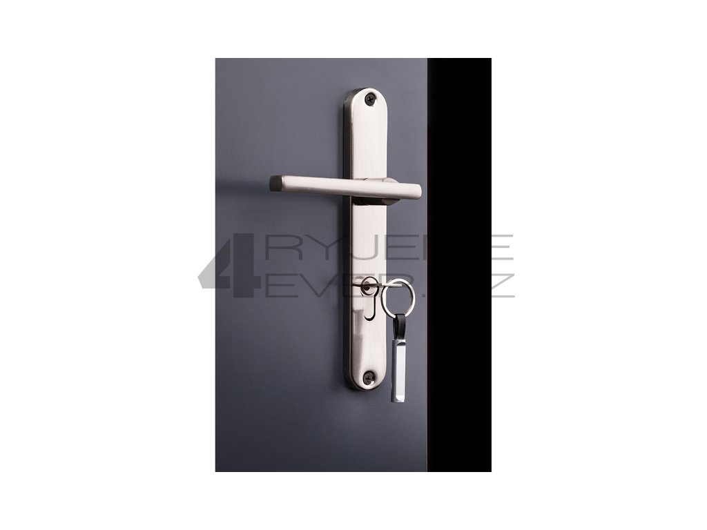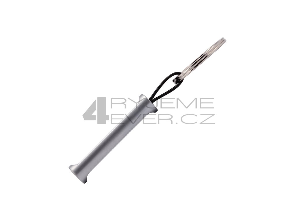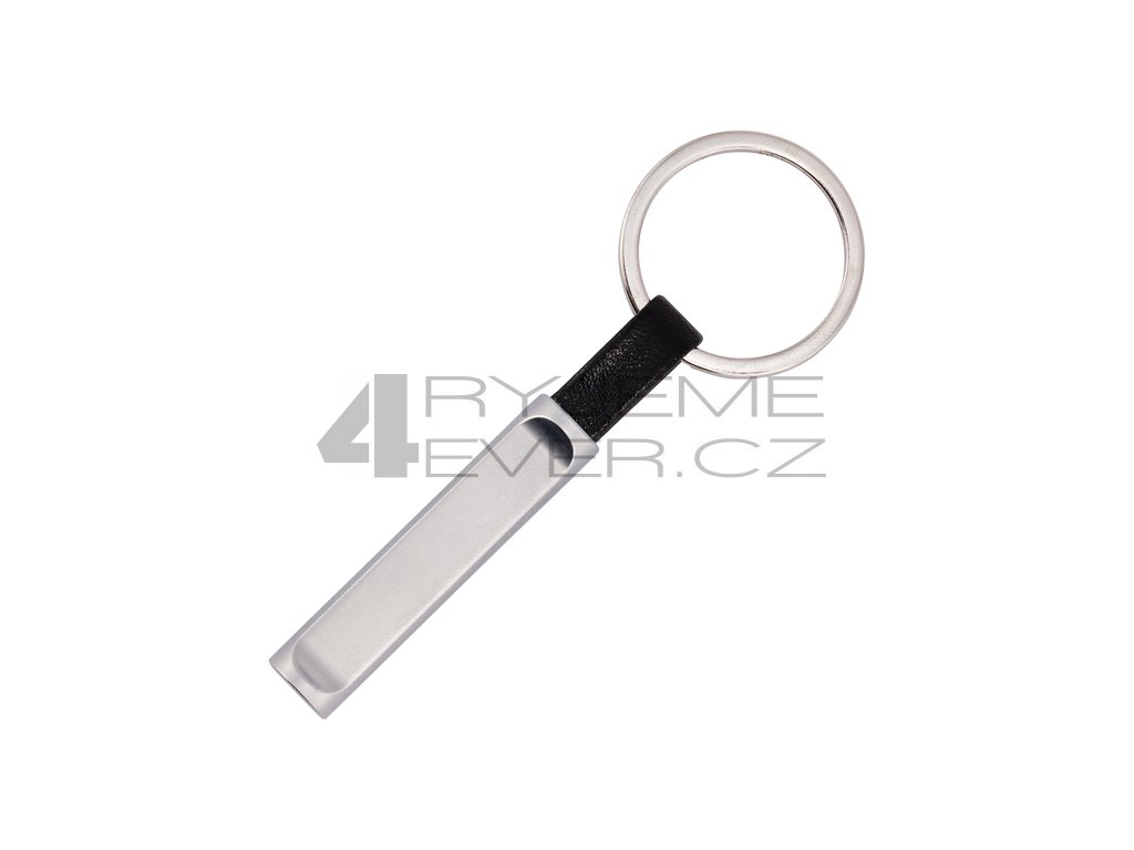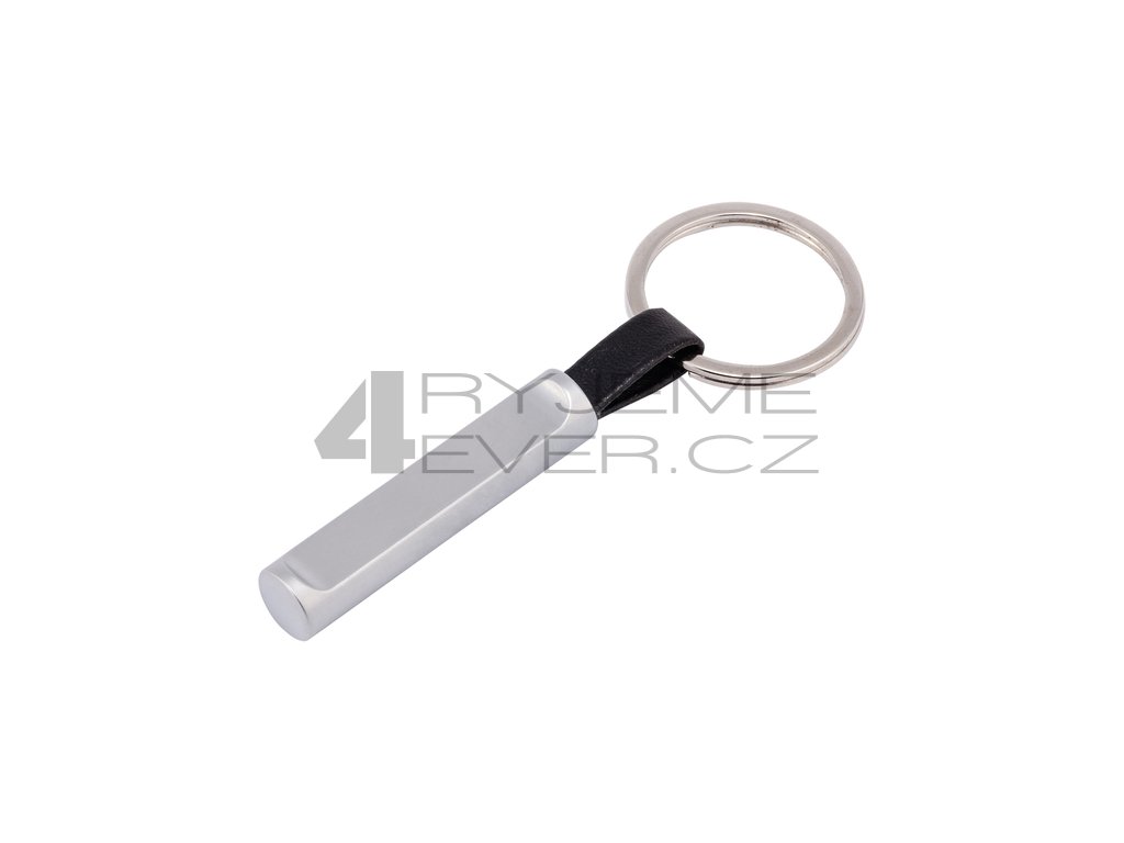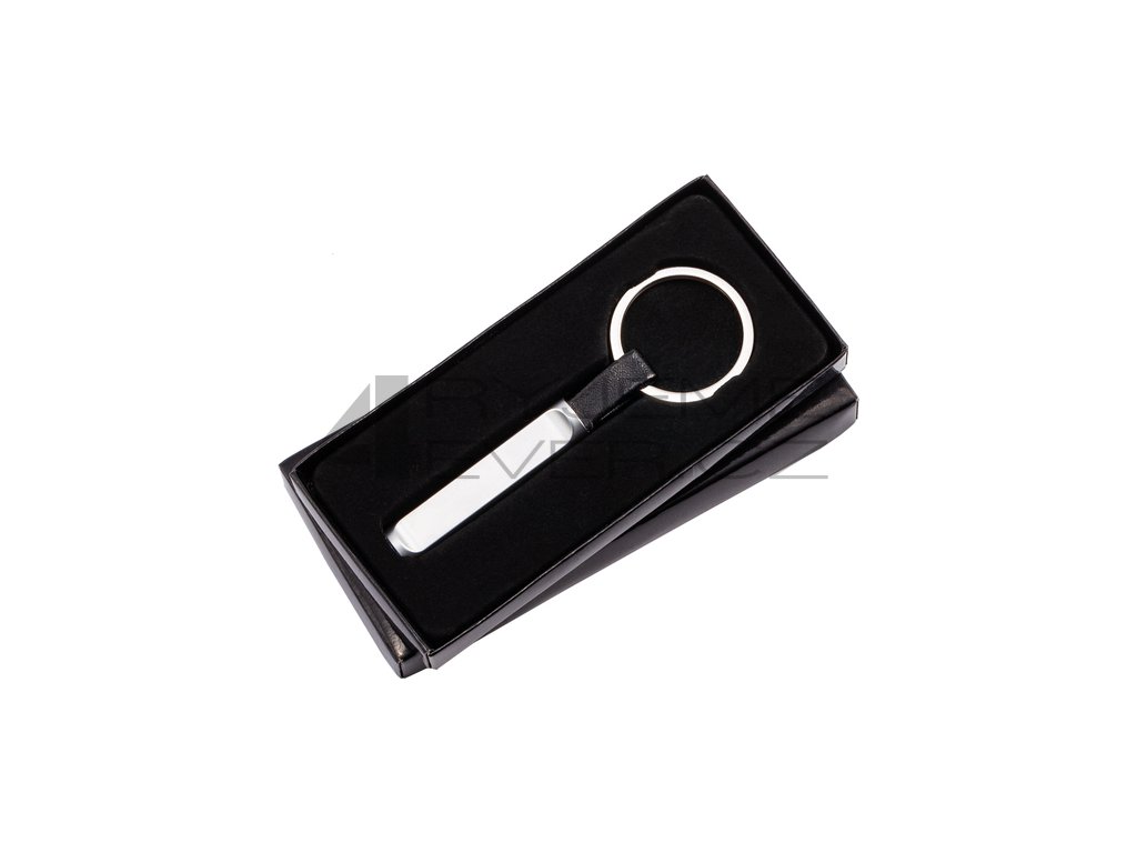Přívěsek na klíče z kovu a PU v černé dárkové krabičce. Vhodná na gravírování textu nebo loga. Rozměr přívěsku 62x10x10mm.