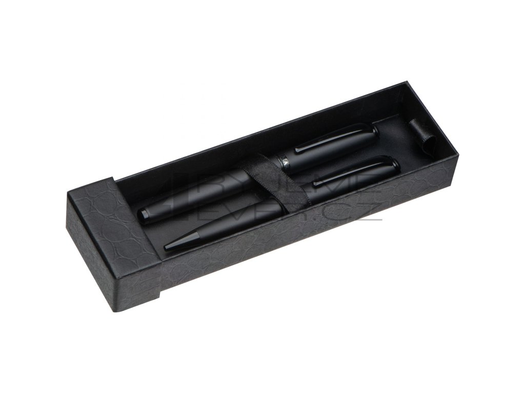 Psací sada Mark Twain v černém dárkovém boxu s kuličkovým perem s modrou náplní a otočným mechanismem a rollerem. Sada v matné černé v kombinaci s lesklými akcenty. Cena s gravírováním je za celou sadu.