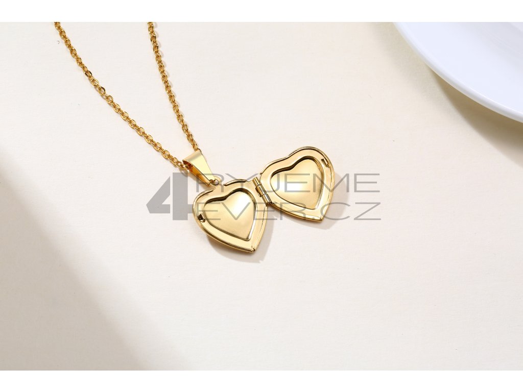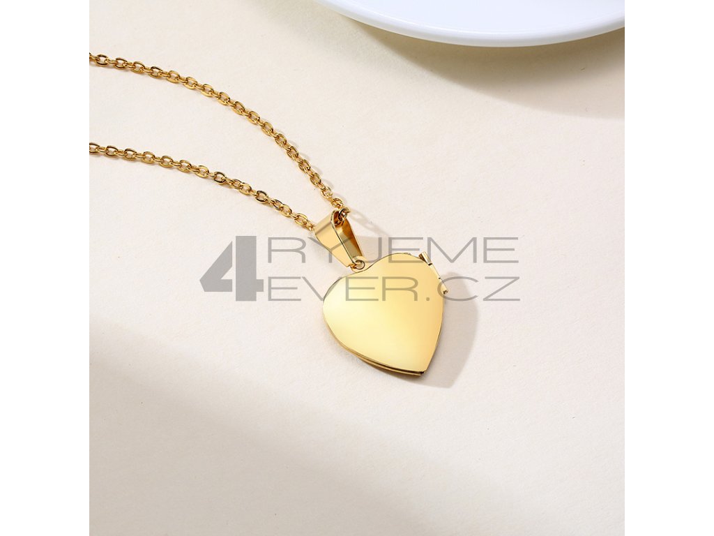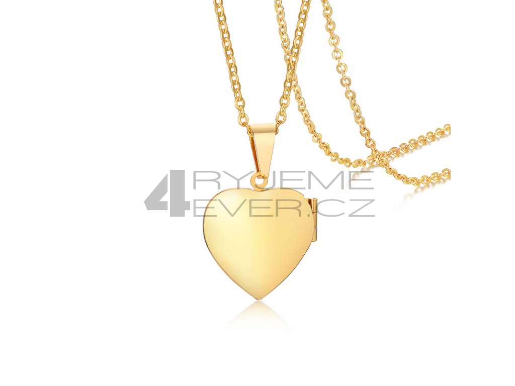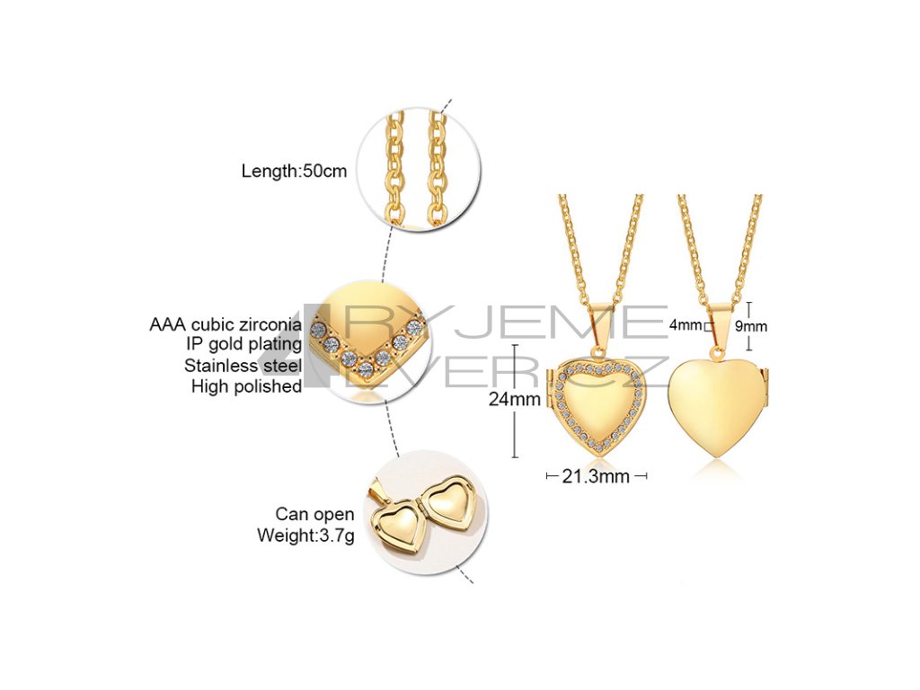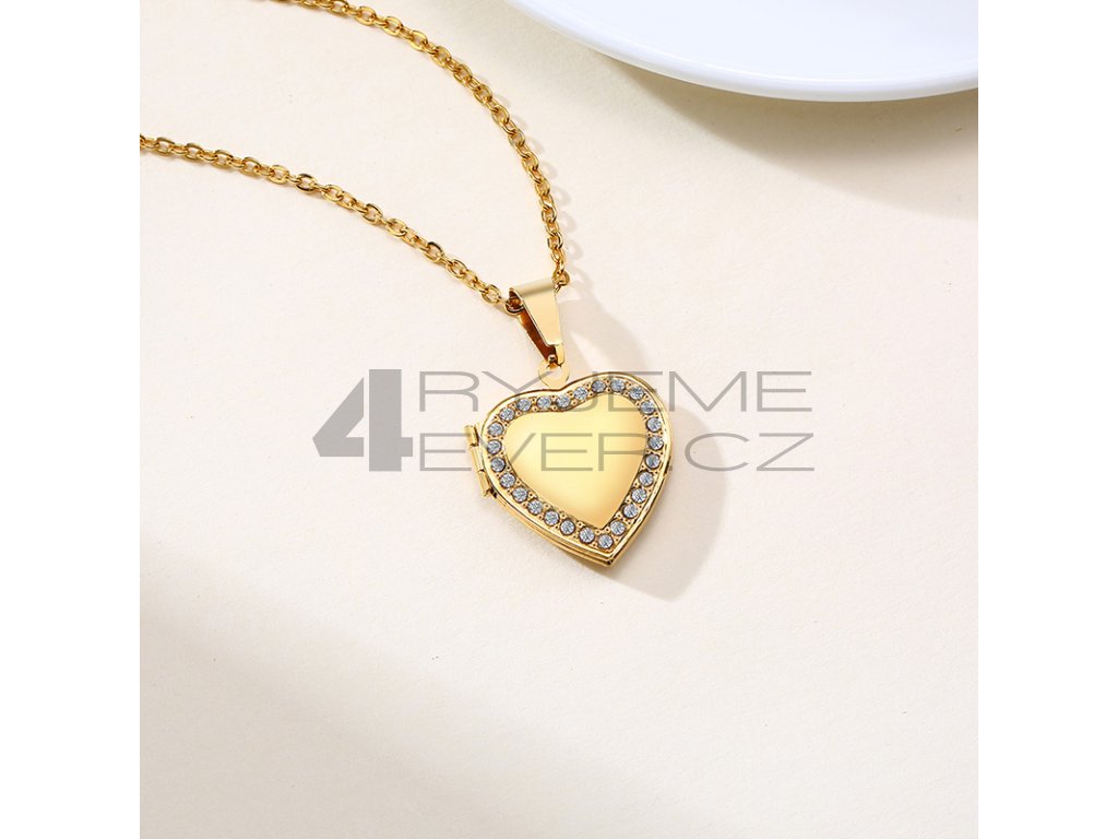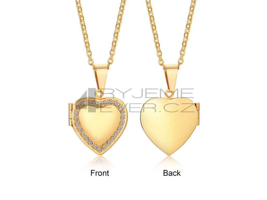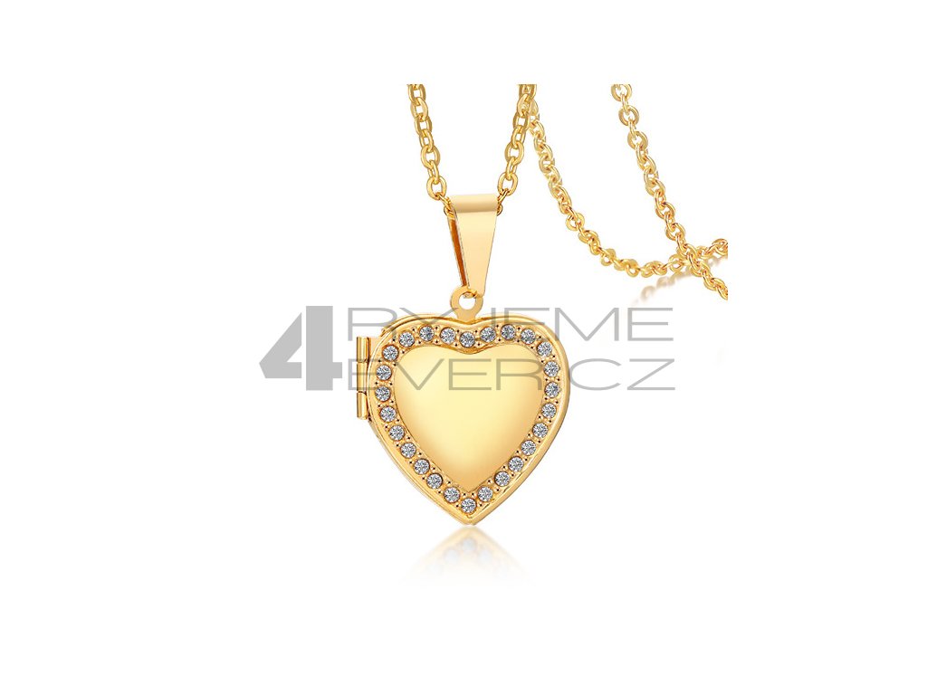 Ocelový přívěsek se zirkonky a řetízkem z chirurgické antialergické oceli 316L, pozlacený. Vhodný na gravírovaní textu, loga ze zadní strany. Fotografie se vkládá dovnitř přívěsku, tisk a vložení je na zákazníkovi. Tuto službu nezajišťujeme!!! Velikost srdíčka 21x24mm. Délka řetízku 50cm.