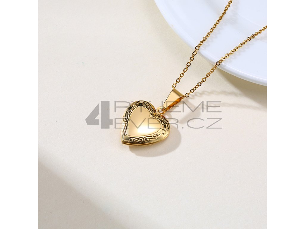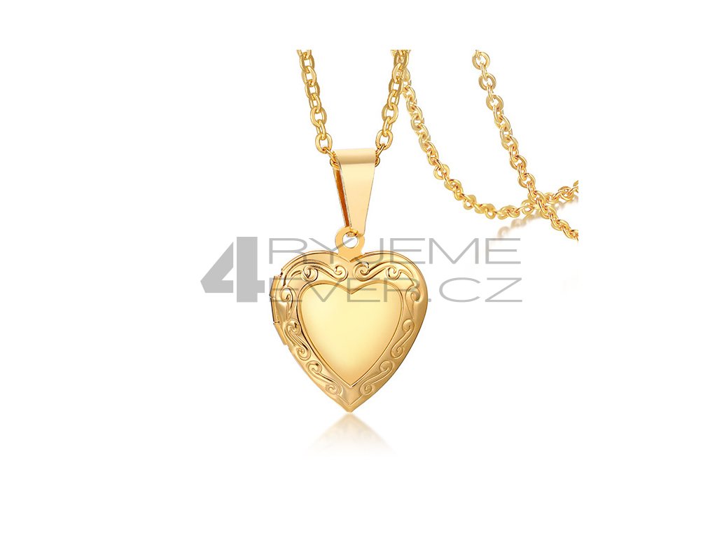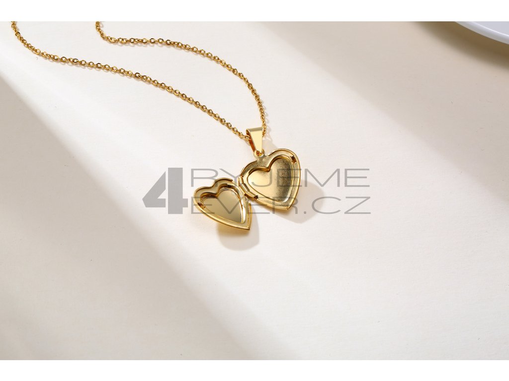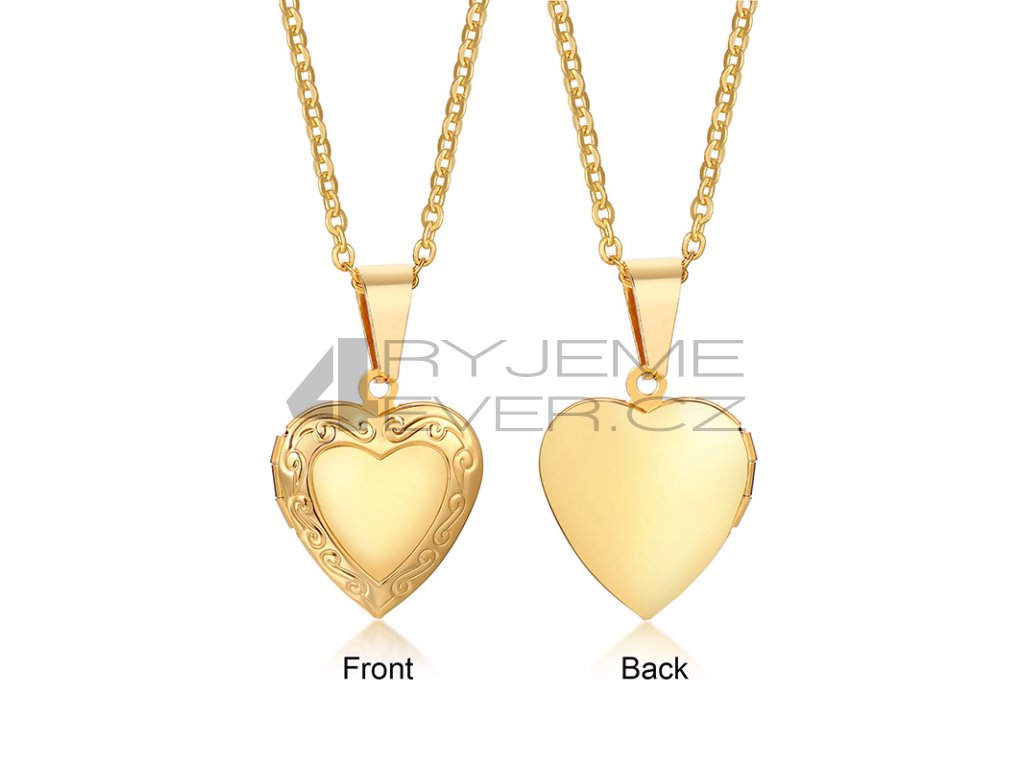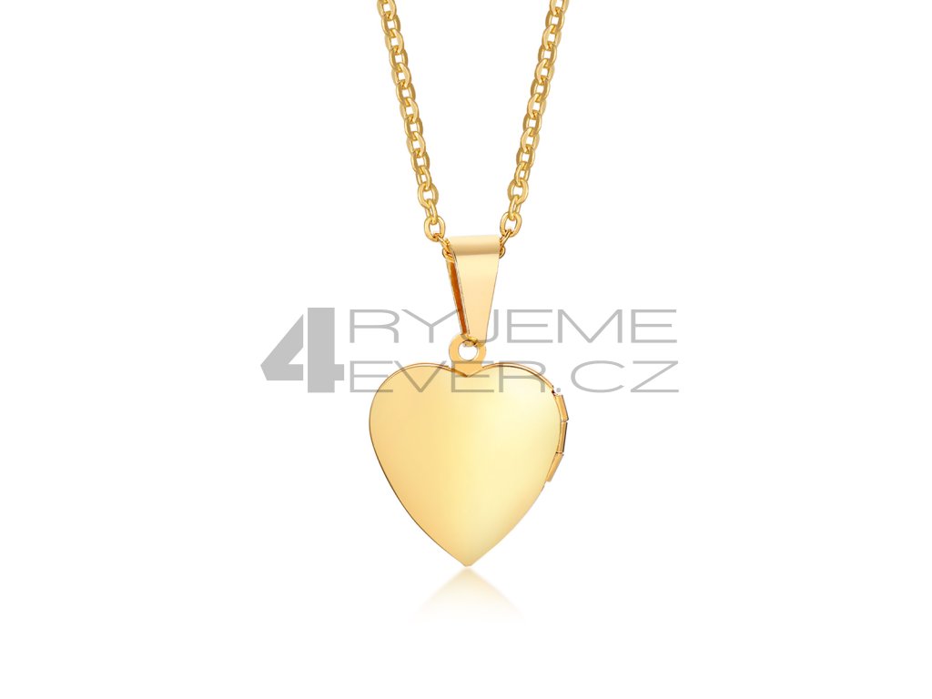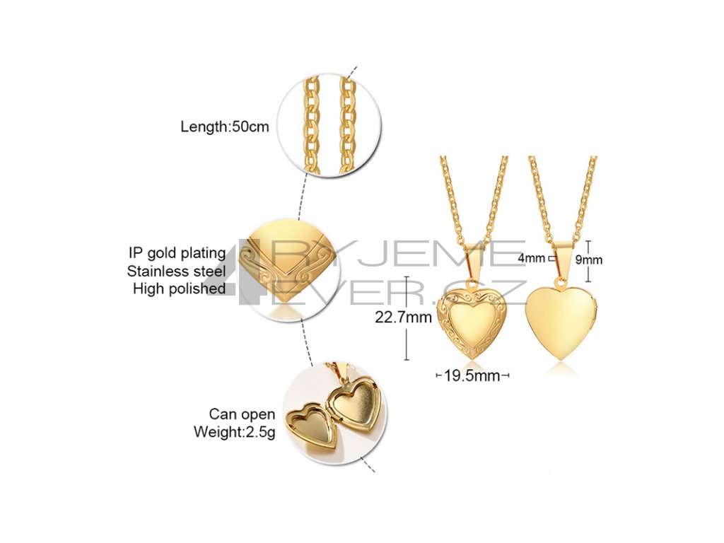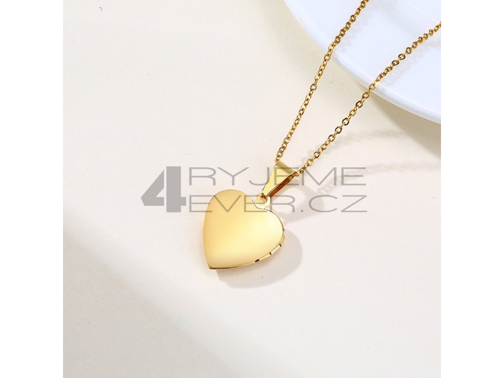Ocelový přívěsek s řetízkem z chirurgické antialergické oceli 316L, pozlacený. Vhodný na gravírovaní textu, loga ze zadní strany. Fotografie se vkládá dovnitř přívěsku, tisk a vložení je na zákazníkovi. Tuto službu nezajišťujeme!!! Velikost srdíčka 19x23mm. Délka řetízku 50cm.
