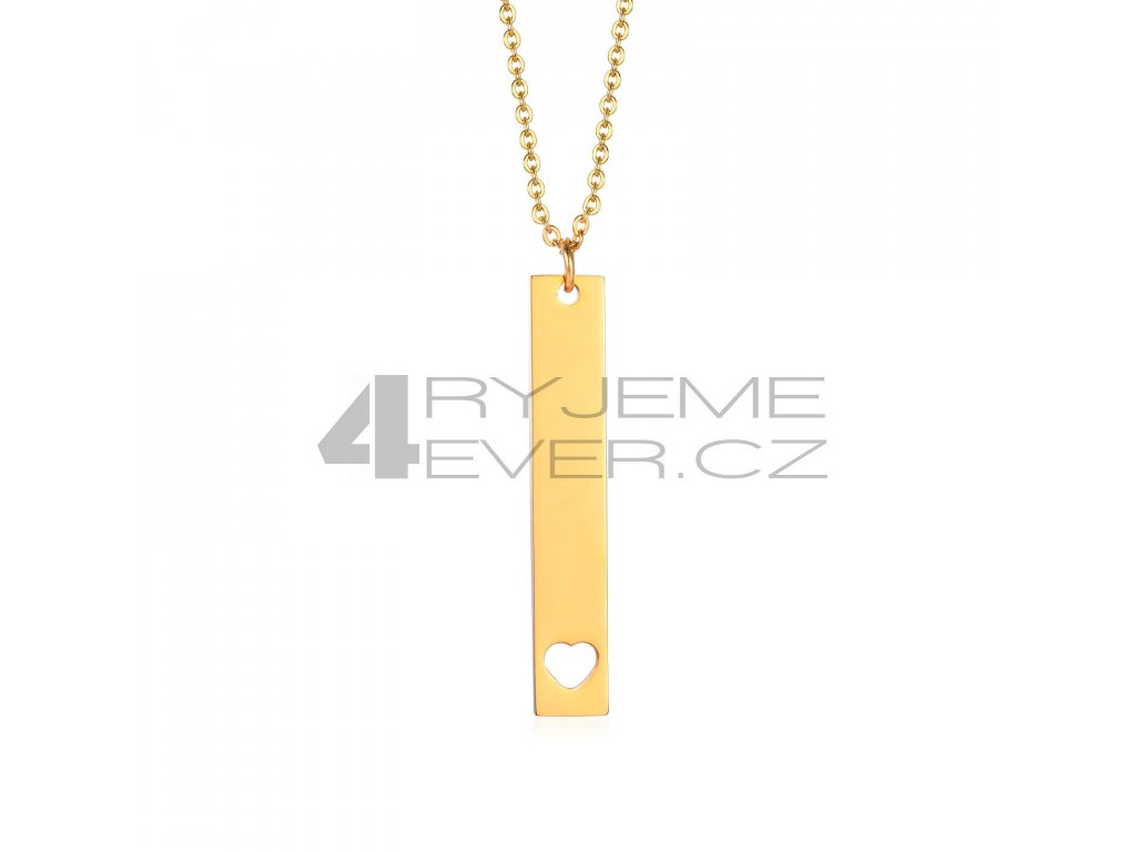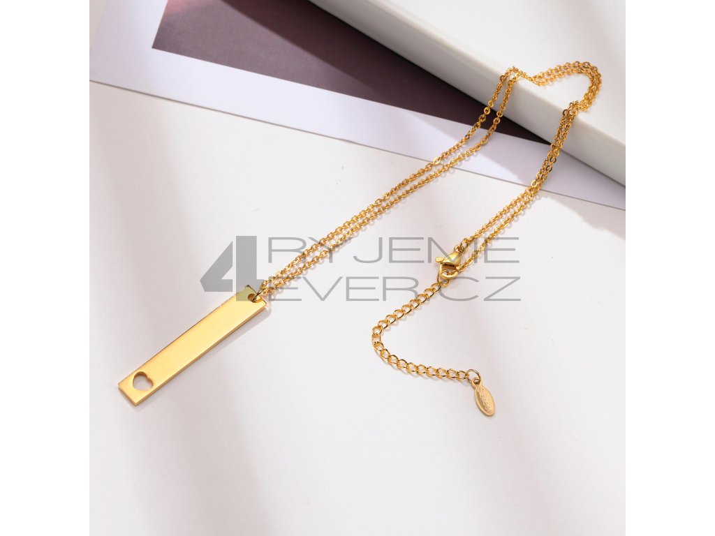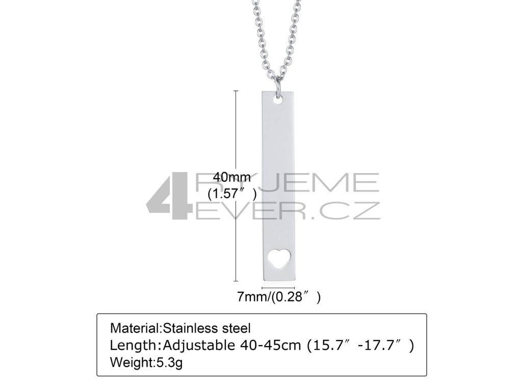 Ocelový přívěsek s řetízkem z chirurgické antialergické oceli 316L. Vhodný na gravírovaní krátkého textu, loga. Rozměr přívěsku 40x7mm, délka řetízku 40-45cm.