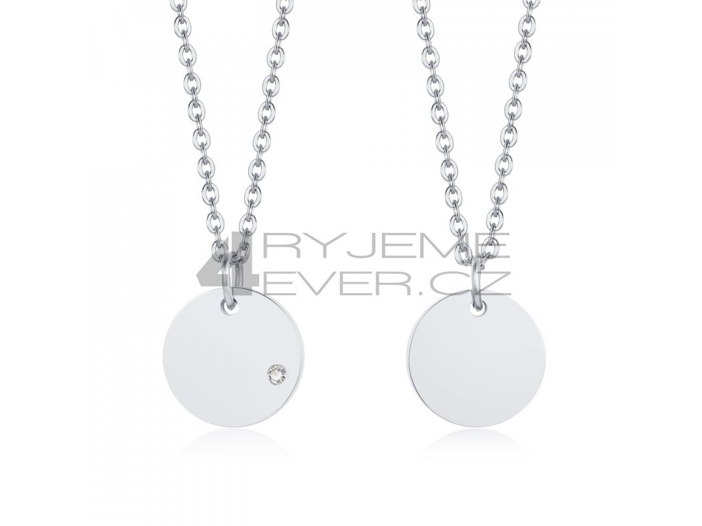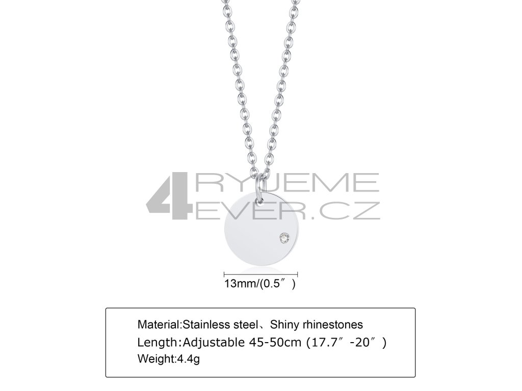 Ocelový přívěsek se zirkonkem a řetízkem z chirurgické antialergické oceli 316L. Vhodný na gravírovaní krátkého textu, loga i fotografie. Průměr přívěsku je 13mm, délka řetízku 45-50cm. Tloušťka řetízku 1,5mm.