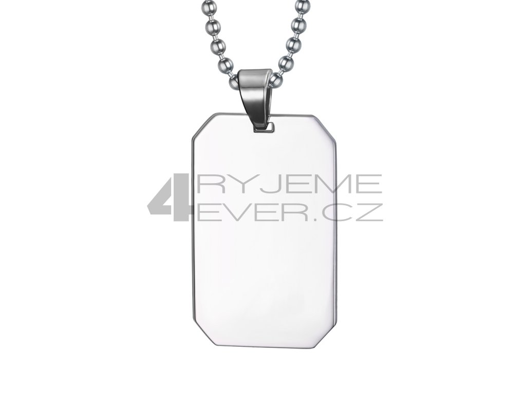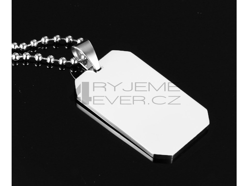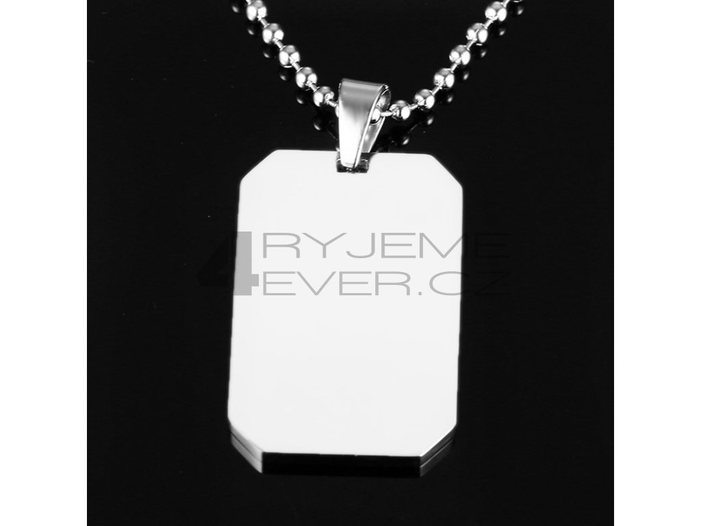 Ocelový přívěsek s řetízkem z chirurgické antialergické oceli 316L. Vhodný na gravírovaní textu, loga i fotografie. Rozměr přívěsku destička 22x43mm. Délka řetízku 50cm.