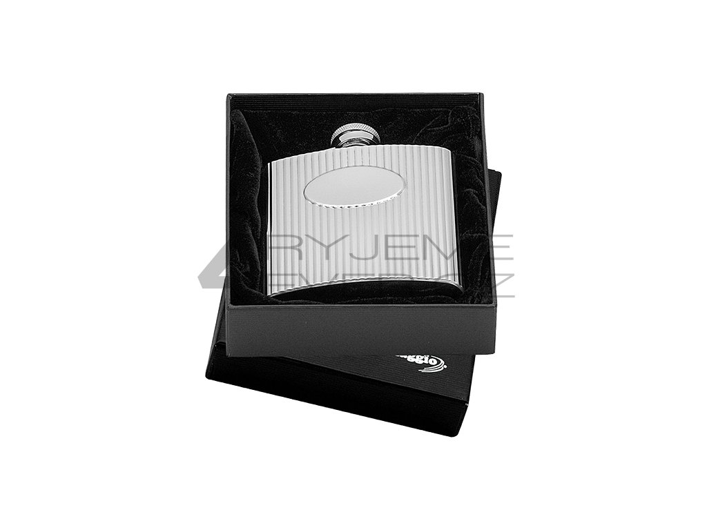 Leštěná nerezová ocel. Obsah 180ml. 95x108x25mm. Součástí balení dárková krabička se sametem.