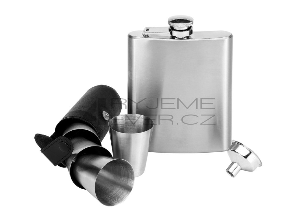 Sada placatka + 4ks kalíšek v pouzdře + nálevka. Broušená nerezová ocel. Obsah 195ml. Placatka rozměr 93x130x22mm. Cena s gravírováním na placatku. Na kalíšky individuální kalkulace dle obtížnosti.