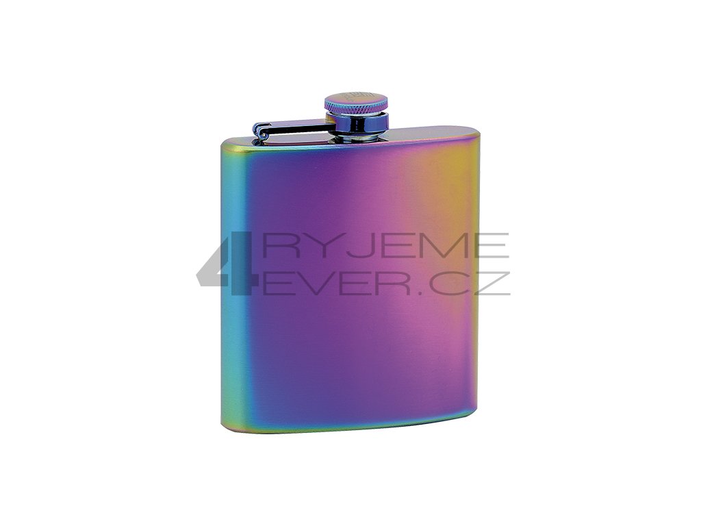 Anodizovaná nerezová ocel. Obsah 175ml. 93x115x23mm. Součástí balení dárková krabička se sametem.
