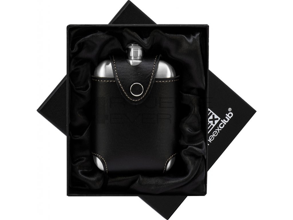 Kapesní placatka Meex Club s černým koženým pouzdrem připínatelným na opasek. Nerezová ocel. Obsah 170ml. Součástí balení dárková krabička se sametem.