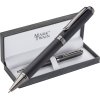 Kovové kuličkové pero Mark Twain s tmavým pochromovaným saténovým povrchem a modrou náplní. Dodává se v dárkovém boxu.