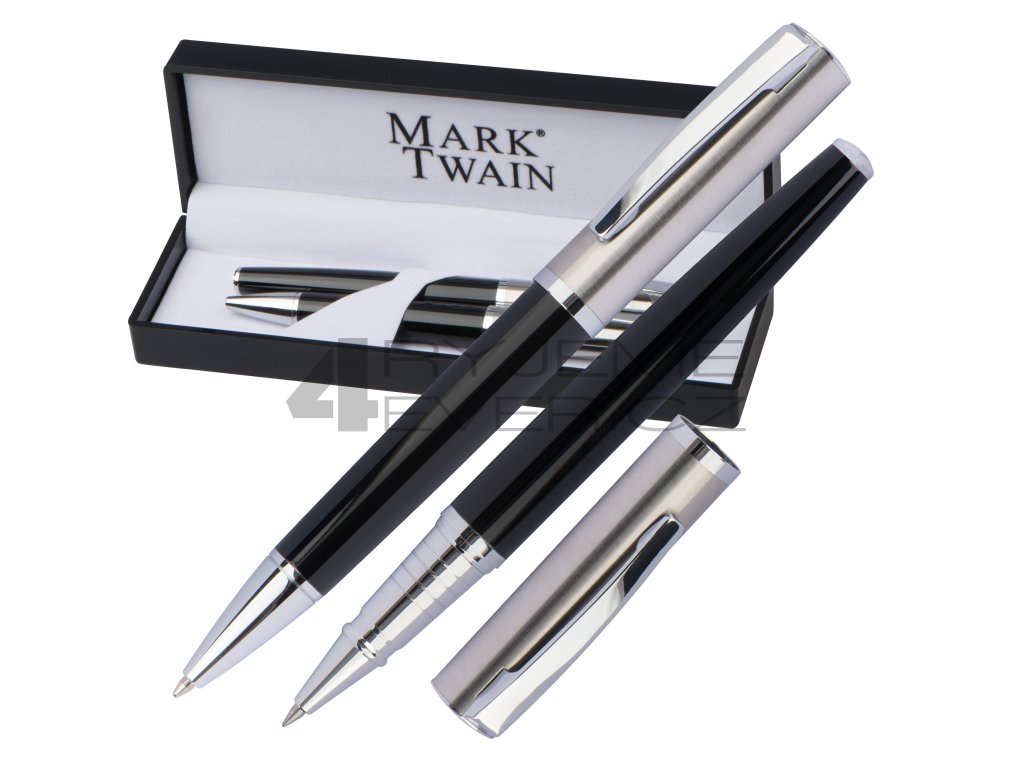 Vysoce kvalitní kovová psací sada značky MARK TWAIN s psacím kuličkovým perem /modrá náplň/ a rollerem. Baleno v dárkovém lesklém akrylovém obalu. Cena s gravírováním je za celou sadu.