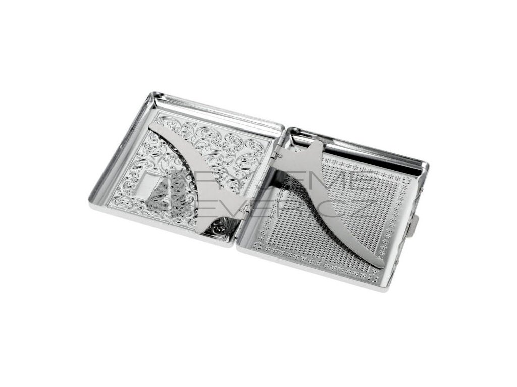Pouzdro na cigarety kovové s pružinou na klasické cigarety (King Size)- cca 20ks. V chromovém lesklém provedení je zdobené gravírovanými ornamenty. Zadní a přední strana pouzdra nejsou stejná. Vhodné na gravírování textu, loga i fotografie.