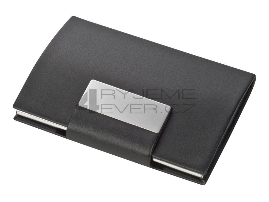 Ocel kombinovaná s černou syntetickou kůží na magnetickou sponu. Vizitkář vhodný na gravírování textu nebo loga.