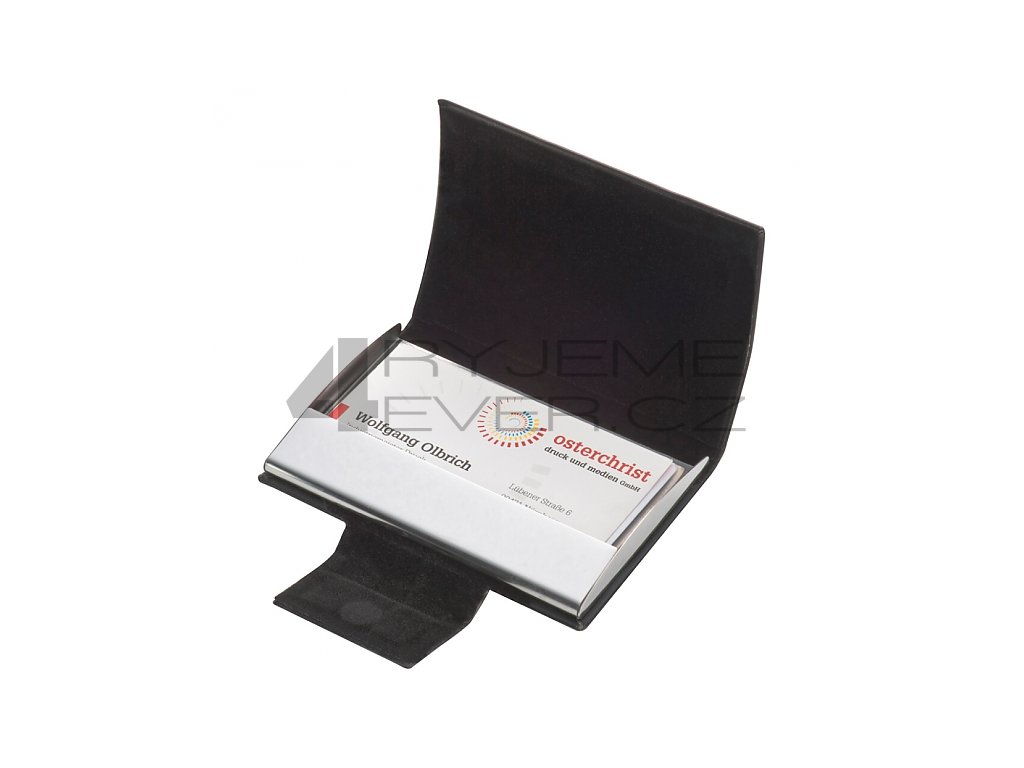 Ocel kombinovaná s černou syntetickou kůží na magnetickou sponu. Vizitkář vhodný na gravírování textu nebo loga.