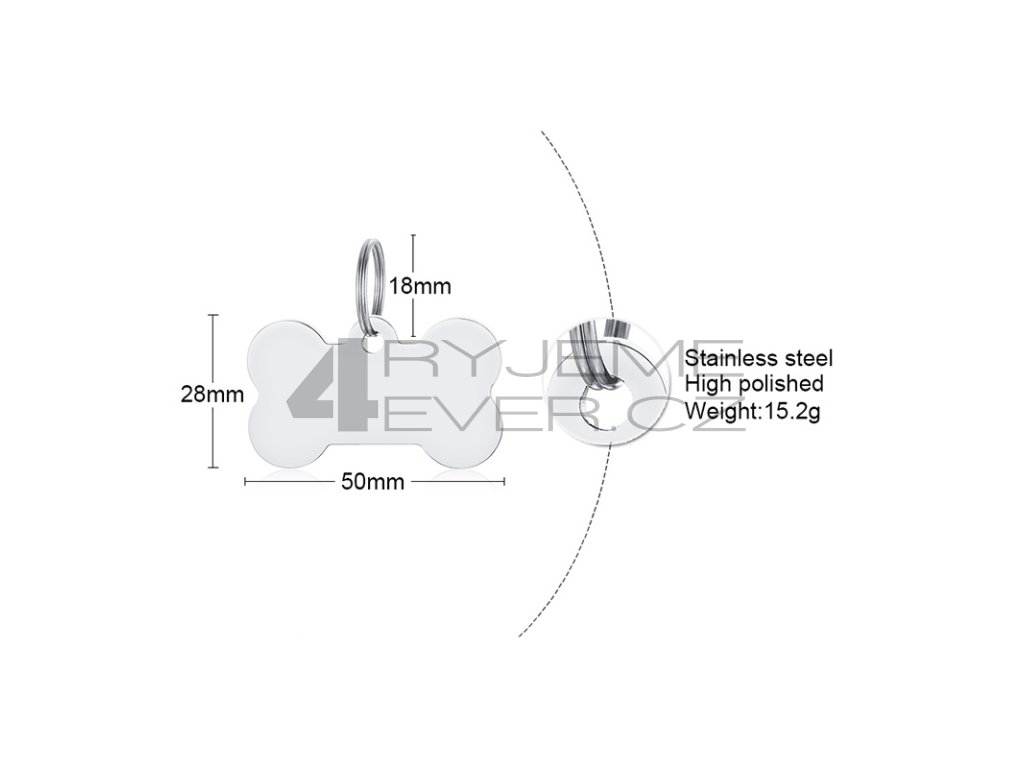 Přívěsek pro Vašeho mazlíčka z nerezové antialergické oceli 316L. Ideální pro gravírování jména, adresy, telefonu nebo e-mailu. Vhodná pro větší plemena. Rozměr přívěsku 50x28mm.